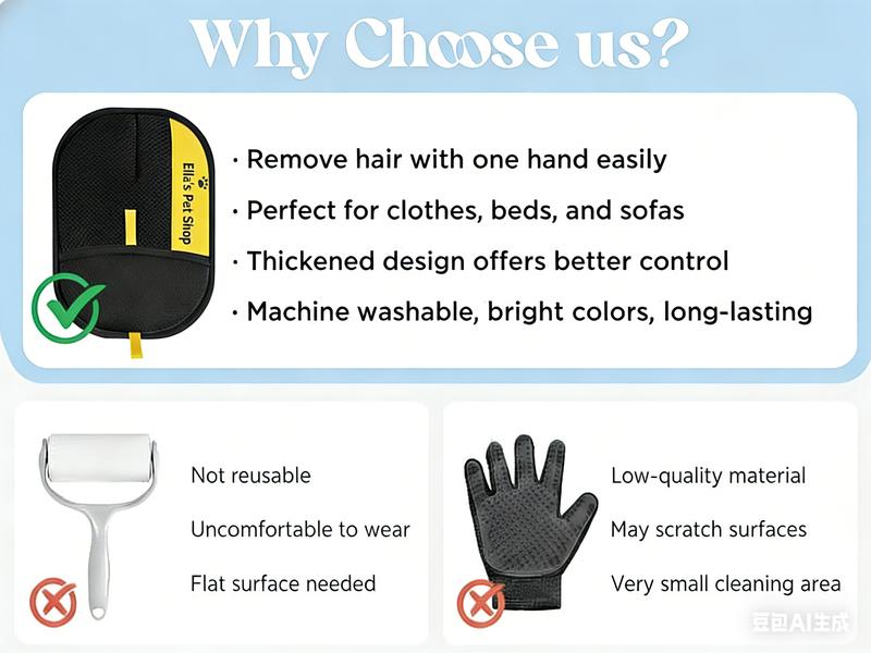 Say goodbye to sticky lint rollers! Our Pet Hair Removal Glove uses static electricity and a unique design to effortlessly collect pet fur. It's easy to use and highly effective at removing pet hair from clothes, furniture, and more. Say hello to hassle-free grooming! 🐾